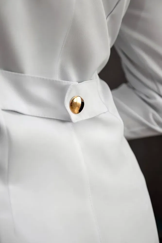 – Tecido Gabardine Branco: De alta qualidade, resistente e não necessita passar, mantendo o caimento perfeito ao longo do tempo.